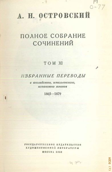 Островский А. Н., Избранные переводы с английского, итальянского, испанского языков. 1865-1879. Полное собрание сочинений Т. 11 — 1952