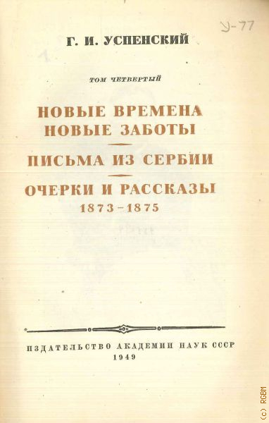 Успенский Г.И., Новые времена - новые заботы. Письма из Сербии. Очерки и рассказы. 1873-1875. Полное собрание сочинений Т. 4 — 1949