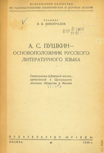 Виноградов В.В., А. С. Пушкин - основоположник русского литературного языка. Стенограмма публичной лекции, прочит. в Центр. лектории О-ва в Москве — 1949