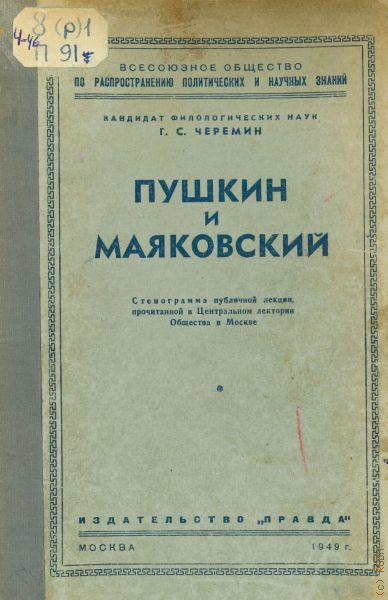 Черемин Г.С., Пушкин и Маяковский. Стенограмма публичной лекции, прочит. в Центр. лектории О-ва в Москве — 1949