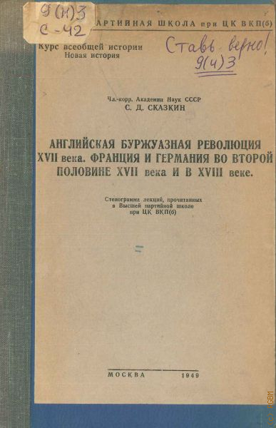 Сказкин С.Д., Английская буржуазная революция XVII века. Франция и Германия во второй половине XVII века и в XVIII веке. Стенограмма лекций... — 1949