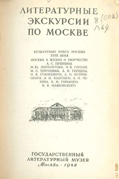![Литературные экскурсии по Москве. культурные очаги Москвы 18 в. : Москва в жизни и творчестве А. С .Пушкина, М. Ю. Лермонтова, Н. В. Гоголя, И. С. Тургенева, А. И. Герцена, Н. В. Станкевича, А. Н. Островского, Л. Н. Толстого, А. П. Чехова, А. М. Горького, В. В. Маяковского : [Сборник статей] — 1948](/searchcat/covers/RGUB-BIBL-0000889019.jpg) |
