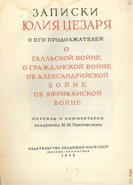 Цезарь Г.Ю., Записки Юлия Цезаря и его продолжателей о Галльской войне, о Гражданской войне, об Александрийской войне, об Африканской войне — 1948 (Литературные памятники. Акад. наук СССР)