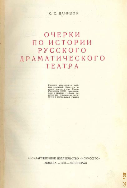 Данилов С.С., Очерки по истории русского драматического театра. ГУУЗом Ком. по делам искусства при Совете министров СССР рекоменд. в качестве учеб. пособия для театр. ин-тов и театр. училищ — 1948
