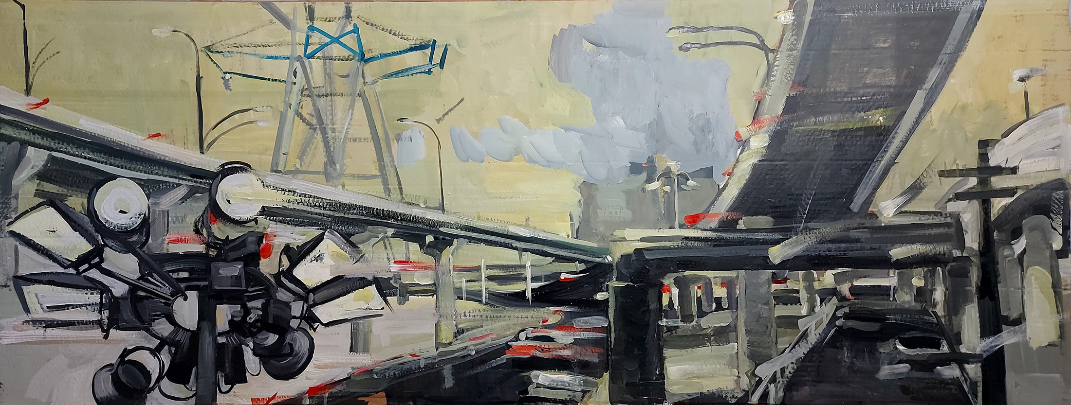 В центре внимания — дорога: пустая трасса с камерами наблюдения, где движение лишено ясной цели и превращается в состояние. Картон подчёркивает хрупкость и временность происходящего, создавая ощущение мира после утраты привычных ориентиров.