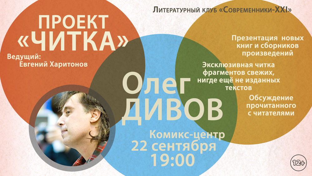 «Читка» проект нового литературного клуба РГБМ «Современники-XXI» под руководством Евгения Харитонова. Первым гостем станет Олег Дивов, автор книг «Лучший экипаж Солнечной», «Мастер собак», «Выбраковка», «Толкование сновидений», «Оружие Возмездия», «Симбионты», лауреат практически всех главных жанровых наград премий «Филигрань», «РосКон», «Звездный мост», «Сигма-Ф», «Странник», Беляевской Премии.