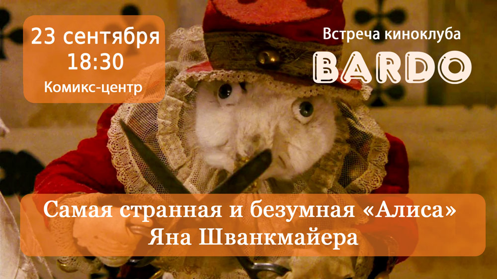 23 сентября в 18:30 приглашаем на встречу киноклуба «Бардо», посвящённую «самой странной безумной Алисе» Яна Шванкмайера.