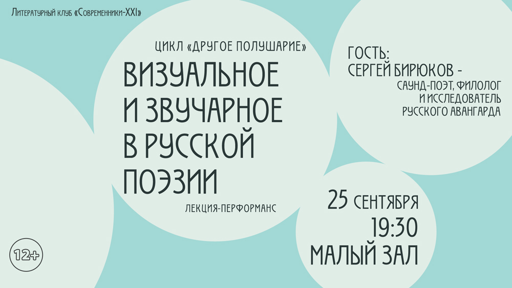 25 сентября в 19:30 литературный клуб «СовременникиXXI» приглашает на лекцию-перфоманс Сергея Бирюкова «Визуальное и звучарное в русской поэзии» из цикла «Другое полушарие».