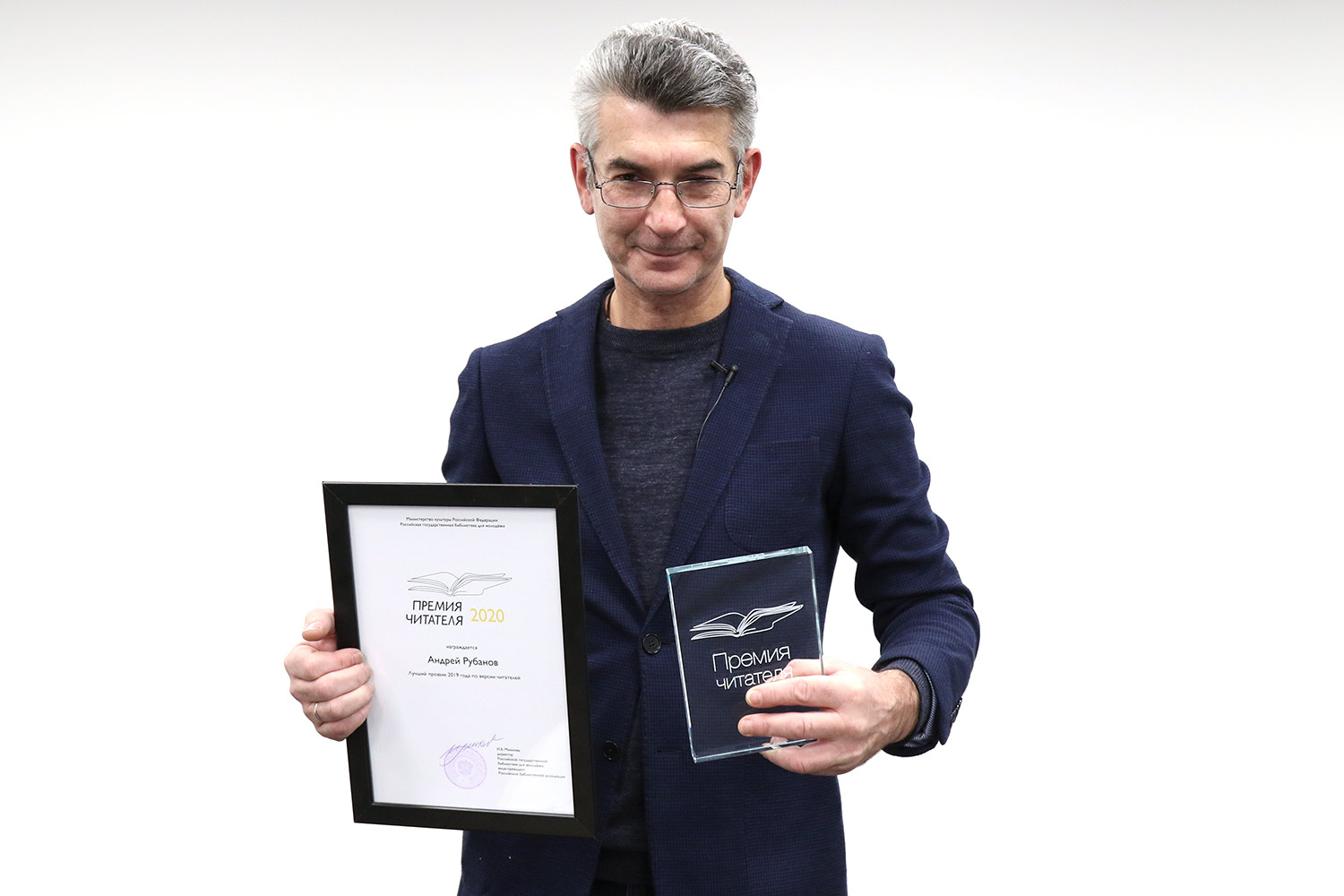 По версии молодых читателей библиотек лучшей книгой 2020 года стал роман прозаика и кинодраматурга Андрея Рубанова. Писателю вручили диплом и памятный приз хрустальную книгу символ премии.
