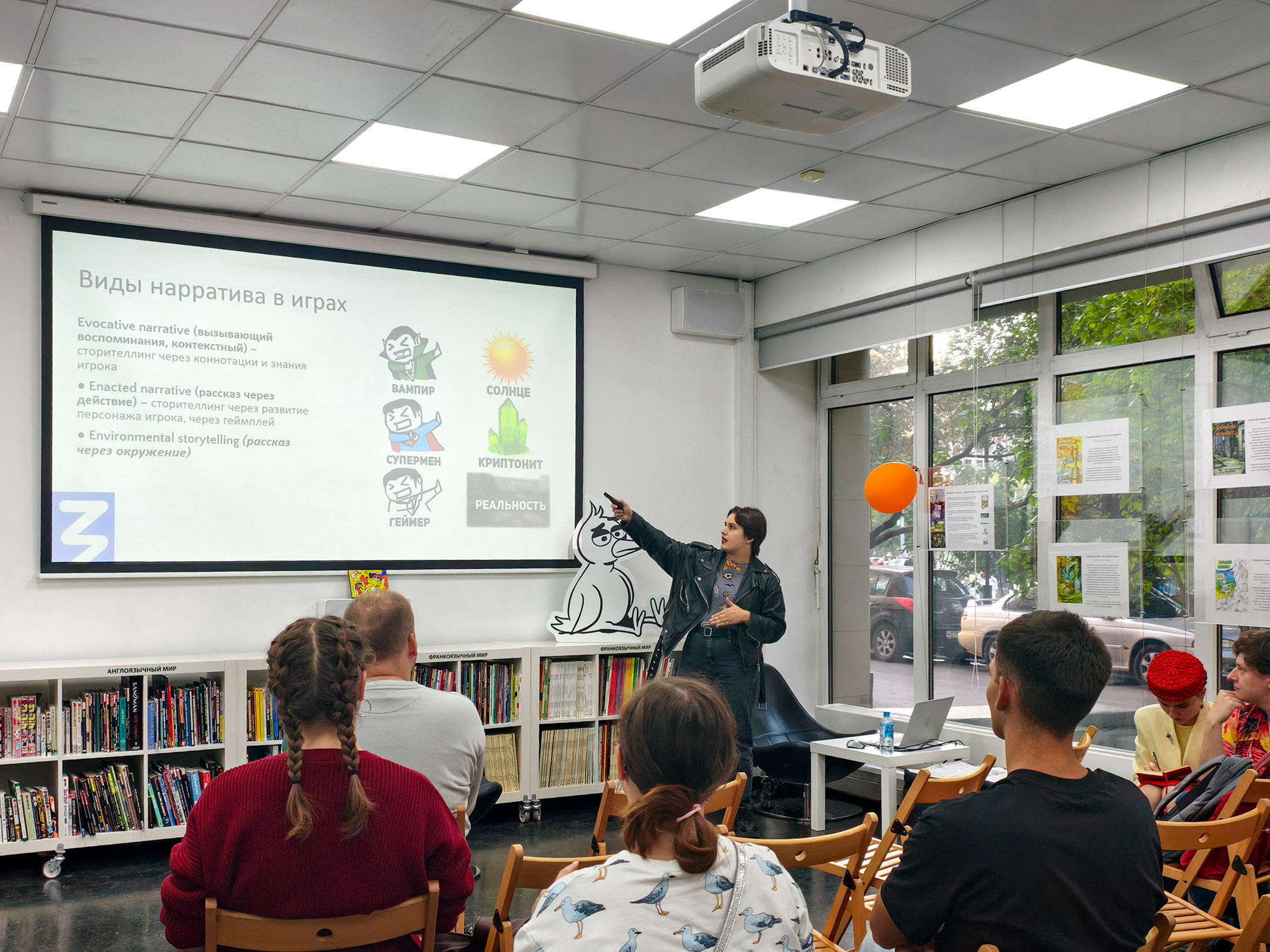 О внутренней кухне геймдева рассказала учащимся кафедры игровой индустрии Анастасия Шалункова, преподаватель школ «Сколка» и «Нарраторика», автор канала о сторителлинге «Сумеречная Настя», член Союза российских литераторов. Она объяснила, в чём специфика каждой из игровых профессий, уделив особое внимание профессии нарративного дизайнера: «Это уникальная специальность, характерная для видеоигр. Задача нарративщика построить мостик между сценаристом, который создаёт историю и персонажей, и геймдизайнером, который разрабатывает игровые механики. От него зависит, как история будет работать в гемйплее и как этот геймплей будет влиять на историю».