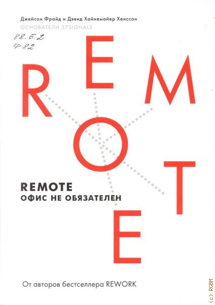 Аннотация: Если вы работодатель и ищете людей только в своем регионе - вы рискуете не найти лучших. Если вы сотрудник и выбираете компании, до которых удобно добираться - вы можете упустить лучшую работу. В своей новой книге основатели 37signals и авторы бестселлера "Rework" показывают, как компании и наемные сотрудники могут эффективно работать вместе, удаленно, с любого стола, в любом помещении, в любом регионе, когда угодно и где угодно. Для владельцев бизнеса, которые хотят собрать у себя в компании настоящую Команду мечты и для квалифицированных специалистов, стремящихся к максимально полной самореализации. Remote - книга, которую так ждали предприниматели 21-го века. Это захватывающее чтение, ломающее привычное представление о рабочем месте. Если вы заинтересованы в удаленной работе, но все еще сомневаетесь, эта книга для вас. Не проходит и дня, чтобы я не подумала или не поговорила о ней, или же не применила ее по-настоящему прорывные идеи. В книге Remote вы найдете мудрые советы людей, преуспевших в создании виртуальных рабочих пространств. Это манифест, призывающий избавиться от душных офисов и от организационной привычки контроля за временем, чтобы уделить свое время лучшим способам работы в нашем новом виртуальном и глобальном мире. Если ваша компания возлагает на вас ответственность за доведение дел до конца, вы просто обязаны прочитать эту книгу