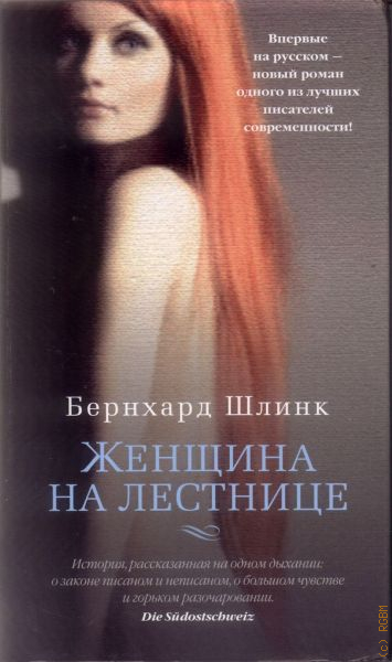 Аннотация: Женщина на лестнице" - новая книга Бернхарда Шлинка, автора знаменитого "Чтеца", - сразу после выхода в свет возглавила список бестселлеров журнала "Шпигель", а права на ее перевод были проданы по меньшей мере в десяток стран. Это роман о любви с почти детективной интригой вокруг картины, исчезнувшей на сорок лет и неожиданно появившейся вновь. Удивительная история связана с запутанными отношениями в любовном четырехугольнике, который составляют изображенная на картине женщина и трое мужчин - крупный предприниматель (заказчик картины), всемирно известный художник и преуспевающий молодой адвокат, который приглашен уладить конфликт между заказчиком и художником, но сам становится действующим лицом конфликта и одновременно рассказчиком истории. Что касается картины, то нельзя не заметить ее сходства с полотном Герхарда Рихтера "Эма. Обнаженная на лестнице" - знаменитым произведением едва ли не самого дорогого среди ныне живущих художников, которого недаром прозвали Пикассо XXI века