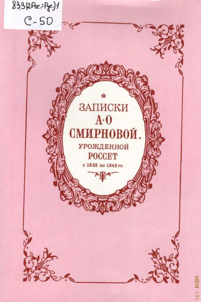 Александра Осиповна Смирнова (урожденная Россет, 1809 — 1882) — одна из выдающихся женщин петербургского светского общества, фрейлина императриц, жена дипломата, отличалась редкой красотой, умом, образованностью и независимостью суждений. Она была в тесных дружеских отношениях со всеми знаменитыми людьми своей эпохи, ее общества добивались и посвящали ей стихи Пушкин, Лермонтов, Вяземский, Хомяков, Ростопчина, Мятлев… Кроме «Автобиографии» и небольшого «Баденского романа» она оставила после себя многочисленные записи, требовавшие большой работы для подготовки к печати, — что и было сделано ее жившей в Париже дочерью Ольгой.