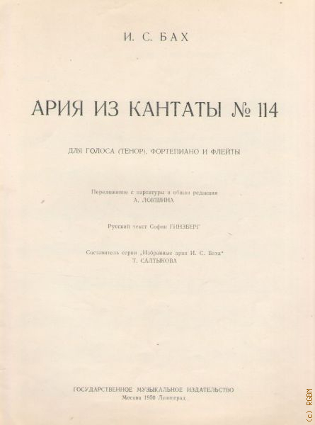 Ария из кантаты — 114: для голоса (тенор),фортепиано и флейты. перелож. с партитуры и общ. ред. А. Лошкина. рус. текст С. Гинзберг. сост. серии Т. Салтыкова