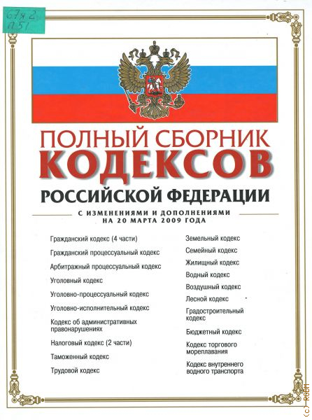 Гражданский кодекс (4 части) ; Гражданский процессуальный кодекс ; Арбитражный процессуальный кодекс ; Уголовный кодекс ; Уголовно-процессуальный кодекс ; Уголовно-исполнительный кодекс ; Кодекс об административных правонарушениях ; Налоговый кодекс (2 части) ; Таможенный кодекс ; Трудовой кодекс [и др.]