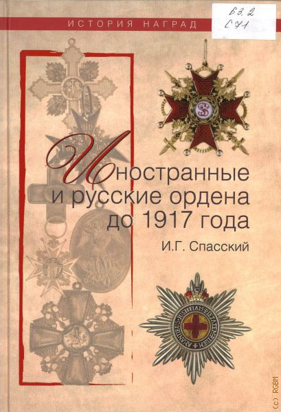 Êëàññè÷åñêàÿ è íàèáîëåå ïîëíàÿ èñòîðèÿ îðäåíîâ, íàãðàäíûõ ìåäàëåé è çíàêîâ Åâðîïû, Àìåðèêè, Àçèè è Ðîññèè íàïèñàíà îäíèì èç ñàìûõ èçâåñòíûõ ñïåöèàëèñòîâ ïî íóìèçìàòèêå, èñòîðèêîì, ãëàâíûì õðàíèòåëåì îòäåëà íóìèçìàòèêè Ãîñóäàðñòâåííîãî Ýðìèòàæà È. Ã. Ñïàññêèì. Èñïîëüçóÿ ìàòåðèàëû óíèêàëüíîé êîëëåêöèè Ýðìèòàæà è, â òî æå âðåìÿ, ïðèâëåêàÿ çíà÷èòåëüíûé ìàòåðèàë èç äðóãèõ ñîáðàíèé, àâòîð ïîäðîáíåéøèì îáðàçîì îñâåùàåò èñòîðèþ ðóññêèõ è èíîñòðàííûõ îðäåíîâ äî 1917 ãîäà