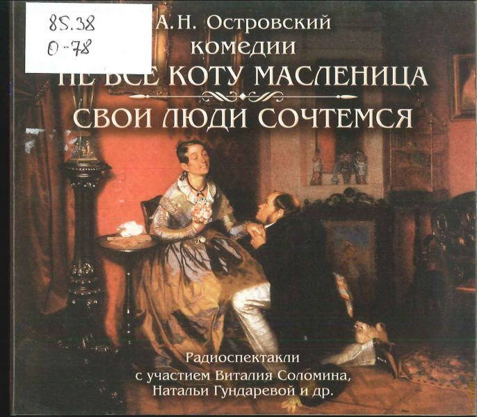 Две блестящие пьесы А. Островского, каждая из которых представляет новую грань его удивительного таланта. «Свои люди сочтемся» — первая вещь автора, которая не только принесла ему всероссийскую славу, но и послужила причиной негласного полицейского надзора. И хоть пьеса вызвала фурор и никого не оставила равнодушным, сам Островский считал ее «слишком жесткой» и постепенно пришел к другому, не менее удачному, способу покорения зрительского сердца. «Пусть лучше русский человек радуется, видя себя на сцене, чем тоскует». Слушал пьесу «Не все коту масленица» тосковать совершенно невозможно. Это один из лучших образцов соединения высокого и комического, непревзойденным мастером которого был и остается великий русский драматург А.Островский.