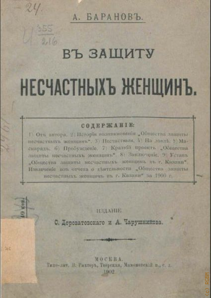 Брошюра посвящена опыту работу Казанского «Общества защиты несчастных женщин» (проституток), по организации приютов, проведению благотворительных акций и др. мер помощи.
