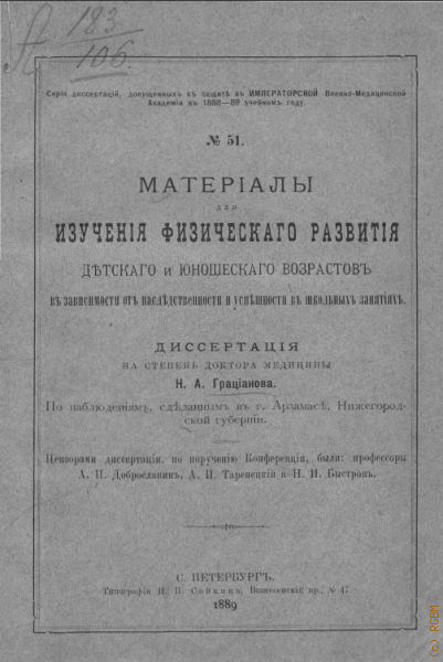 Диссертационное исследование, в котором автор доказывает зависимость уровня физического развития детей и подростков от наследственности и успешности в школьных занятиях. На примере г. Арзамаса Нижегородской губернии.
