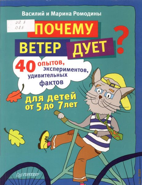 Издетальство Питер выпустило в свет книгу «Почему ветер дует? 40 опытов, экспериментов, удивительных фактов для детей от 5 до 7 лет» в 2013 году. Она на 96 страницах, у нее мягкая обложка. Автор издания Ромодин В. В. Книга выпущена в серии Вы и ваш ребенок по цене 165.00 рублей. ISBN номер 978−5-49 807−851−9. Откройте эту книгу, и вы поймете, откуда берутся облака и почему в небе светит радуга, от чего желтеют листья и зачем осенью птицы улетают на юг. Вы научитесь различать деревья по листьям и узнаете, как «пьют» растения. Эта книга даст ответы на десятки «почему» и поможет связать воедино разные природные явления. Занимательные эксперименты и опыты помогут «увидеть» звук, «сделать облако» в банке, вырастить кристаллы из соли и тюльпан к 8 Марта, узнать, сколько воды получится из стакана снега и как дождевой червяк перемешивает почву. Множество удивительных фактов, кроссвордов, ребусов, игр и раскрасок сделают чтение этой книги увлекательным и веселым занятием.