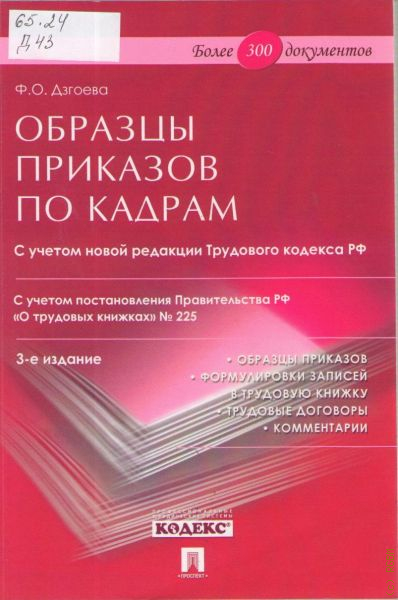 Книга является первым сборником форм приказов по кадрам, учитывающим новую редакцию Трудового кодекса, на основе которого подобраны примеры заполнения унифицированных форм приказов о приеме, переводе, увольнении работников, направлении их в командировки. Приведены образцы формулировок записей в трудовые книжки, учитывающие последние изменения в Трудовом кодексе РФ и постановление Правительства Р Ф «О трудовых книжках» —255. Также прокомментированы основные положения и последние изменения в трудовом законодательстве, касающиеся работы кадровой службы предприятия, вопросов ведения трудовых книжек индивидуальными предпринимателями. Использование приведенного в книге материала позволит избежать нарушений нового трудового законодательства в правоприменительной деятельности организаций и индивидуальных предпринимателей. Для специалистов по трудовому праву, работников кадровых служб, юристов предприятий, индивидуальных предпринимателей.