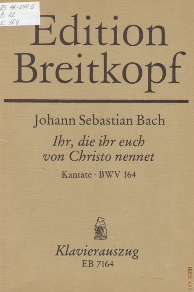 Ihr, die ihr euch von Christo nennet: Kantate: BWV 164: Zum 13. Sonntag nach Trinitais für Sopran, Alt, Tenor, Baß; vierstimmigen Chor; Flauto traverso I / II, Oboe I / II; Violino I / II; Viola; Basso continuo. Klavierauszug von Bernhard Todt