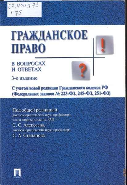 Учебное пособие соответствует программе учебной дисциплины «Гражданское право», в котором последовательно изложен курс гражданского права в форме кратких ответов, в доступной форме раскрывающих основные теоретические вопросы, разбираемые на семинарских занятиях, включаемые в билеты для зачетов и экзаменов в соответствии с государственными стандартами. Пособие подготовлено известными специалистами в области гражданского права на основе действующего законодательства, включая часть четвертую Гражданского кодекса РФ. Для студентов, аспирантов и преподавателей юридических факультетов вузов.