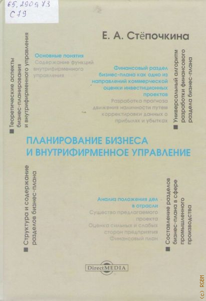 Учебное пособие содержит теоретические основы бизнес-планирования, методику и пример расчета разделов бизнес-плана. План бизнеса рассматривается не только как форма обоснования предпринимательской идеи, но и как элемент системы управления коммерческой организацией, возникающей в процессе реализации идеи. Издание адресовано студентам экономических специальностей вузов, специалистам по разработке и аудиту бизнес-планов, менеджерам, обеспечивающим жизнеспособность и развитие вверенных им организаций.