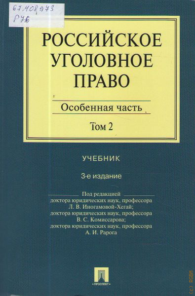 Учебник является третьим, переработанным и дополненным изданием, подготовленным профессорами кафедр уголовного права Московского государственного юридического университета имени О. Е. Кутафина и юридического факультета Московского государственного университета имени М. В. Ломоносова с учетом последних изменений и дополнений, внесенных в УК РФ. Использованы материалы опубликованной судебной практики за последние годы. Для студентов высших учебных заведений, слушателей курсов повышения квалификации, аспирантов, преподавателей, а также работников правоохранительных органов. Законодательство приведено по состоянию на декабрь 2009 г.