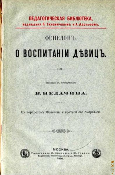 Франсуа Фенелон, французский священнослужитель, писатель, педагог, богослов выпустил книгу «О воспитании девиц» в 1687 году. В ней он подверг критике господствовавший в то время взгляд, согласно которому девочек достаточно было обучать, кроме закона Божия, только тому, что необходимо женщине для внешнего успеха. Фенелон настаивал на том, что женщина — прежде всего мать; она должна воспитывать сыновей на пользу королю и отечеству; он ратует за достоинство женщины, требуя, чтобы ей давали образование и облагораживали её ум. Между тем образование это, по Фенелону, следует ограничить умением правильно говорить, читать и писать, производить четыре действия арифметики; знанием основных элементов права, знакомством с древней и французской историей. Этот трактат лег в основу воспитания Сен-Сирского пансиона, основанного мадам де Ментенон и впоследствии взятого за образец ЕкатеринойII при создании Смольного института в Петербурге. По мнению издателя и переводчика, данный труд не утратил своего значения и в конце 19 века. Книга снабжена подробной биографией Фенелона.