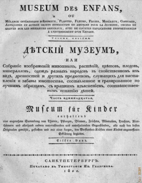 Детский музеум или собрание изображений животных, растений, цветов, плодов, минералов, одежд разных народов в свойственном их виде, древностей и других предметов, служащих для наставления и забавы юношества, составленное и гравированное по лучшим образцам, с кратким изъяснением соответственным понятиям детей