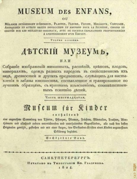 Детский музеум или собрание изображений животных, растений, цветов, плодов, минералов, одежд разных народов в свойственном их виде, древностей и других предметов, служащих для наставления и забавы юношества, составленное и гравированное по лучшим образцам, с кратким изъяснением соответственным понятиям детей