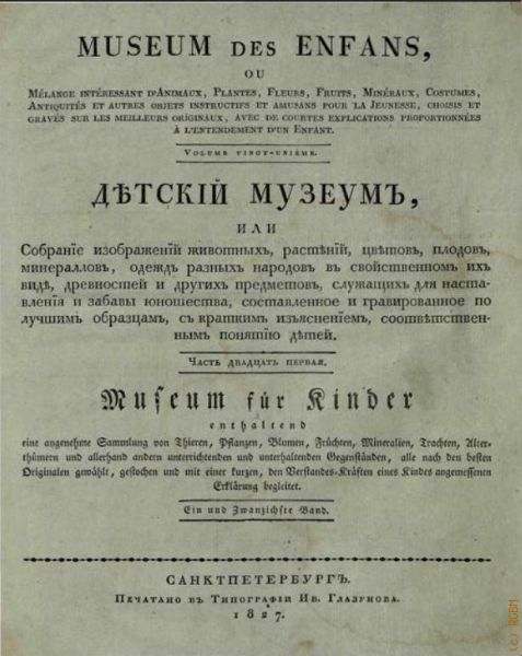 Детский музеум или собрание изображений животных, растений, цветов, плодов, минералов, одежд разных народов в свойственном их виде, древностей и других предметов, служащих для наставления и забавы юношества, составленное и гравированное по лучшим образцам, с кратким изъяснением соответственным понятиям детей