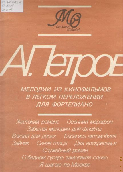 Романс о романсе. А напоследок я скажу: из кф "Жестокий романс" / сл. Б. Ахмадулиной. Под лаской плюшевого пледа: из кф "Жестокий романс" / сл. М. Цветаевой. А цыган идет: из кф "Жестокий романс" / сл. Р. Киплинга, пер. Г. Кружкова. Мелодия: из кф "Осенний марафон"; Мелодия: из кф "Вокзал для двоих"; Мелодия: из кф "Забытая мелодия для флейты"; Вальс: из кф "Берегись автомобиля"; Юмореска: из кф "Зайчик"; Песня материнской любви. Зов синевы: из кф "Синяя птица" / сл. Т. Харрисона, рус. текст Т. Калининой. Голубые города: из кф "Два воскресенья" / сл. Л. Куклина. Моей душе покоя нет: из кф "Служебный роман" / сл. Р. Бернса, пер. С. Маршака. Мелодия: из кф "Служебный роман"; Полька-галоп. Вальс. О бедном гусаре: из тф "О бедном гусаре замолвите слово"; Вальс: из кф "Я шагаю по Москве"; Я шагаю по Москве: из кф "Я шагаю по Москве" / сл. Г. Шпаликова