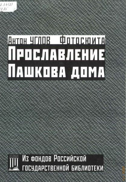 Цикл фотографий Антона Углова «Прославление дома Пашкова » был создан автором в 1928 году. На снимках с разных точек города сняты виды Москвы, в каждом из которых присутствует здание Пашкова дома — подлинная жемчужина архитектуры XVIII столетия. Оригинальные фотографии Д. А. Кашинцева (1888—1937), публиковавшего свои работы под псевдонимом Антон Углов, хранятся в отделе изоизданий Российской государственной библиотеки. На этих фотографиях не сохранились авторские названия, поэтому они публикуются с современными названиями и комментариями. В тоже время макет издания восходит к авторскому оформлению А. Углова (размер и цвет паспарту, заголовок цикла), также воспроизводится дизайн — заголовок, приготовленный самим фотографом для одной из фотовыставок. Комплект включает 16 фоторепродукций из цикла «Прославление Пашкова дома «, брошюру с кратким биографическим очерком фотографа, репринтный оттиск статьи А. Углова «Научная фотодокументация архитектуры » из журнала «Фотограф «(1929) и фрагмент карты Москвы того времени. Все исторические материалы восходят к 1928 г. — тогда были созданы фотографии, написана статья и издана «Карта Московской губернии «. Очерк А. Лариной «Фотосюита Антона Углова о Пашковом доме » дает современному читателю представление о насыщенной общественной и творческой деятельности Д. А. Кашинцева, его трагической судьбе