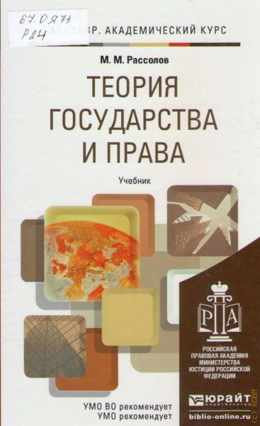 Рассматриваются предмет, методы, основные тенденции развития науки о государстве и праве, ее современное состояние и преследуемые ею цели, а также пути их достижения. Раскрываются основные понятия и категории этой фундаментальной юридической науки. Подробно рассказывается о происхождении государства, его сущности, содержании, формах, политической системе общества, о нормах и источниках права, о системе праваи системе законодательства, юридической ответственности. Излагаются концепции правосознания и правовой культуры в современном обществе. Учебник соответствует Государственному образовательному стандарту высшего профессионального образования и подготовлен в соответствии с программой курса «Теория государства и права».Для студентов вузов, обучающихся по специальностям 30 501 (21 100) «Юриспруденция», 30 505 (23 100) «Правоохранительная деятельность», 30 502 (250 600) «Судебная экспертиза», 50 402 (32 700) «Юриспруденция (учитель права)», 521 400 (30 500) «Юриспруденция (бакалавр)», а также для аспирантов и преподавателей юридических вузов и факультетов. Книга будет полезна государственным и муниципальным служащим, а также всем, кто интересуется проблемами теории государства и права. Об авторе: Рассолов М. М. — доктор юридических наук, профессор, заведующий кафедрой теории и истории государства и права РПА Минюста России.