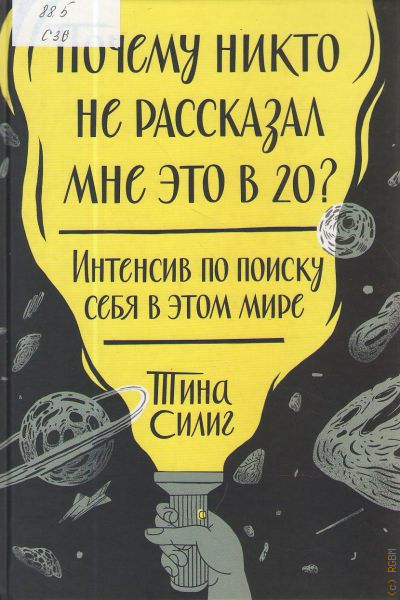 Книга «Почему никто не рассказал мне это в 20? Интенсив по поиску себя в этом мире» была написана Тиной Силиг для её сына, но пользуется успехом у многих. У такой популярности есть причина — те, кто прочитал её, признают, что их отношение к жизни и успеху изменилось. Автор этой книги является одним из лучших и любимых преподавателей у студентов университета в Стенфорде. Она учит молодых людей мыслить креативно, творчески подходить к решению учебных задач, а вместе с этим и к решению любых жизненных проблем. Достичь успеха, создать что-то новое, необычное хотят многие, но из них лишь единицам удаётся это сделать. Чаще всего проблема заключается в том, что люди создают себе определённые рамки, за которые не желают или боятся выходить. Можно сказать, что люди движутся по одной дороге, не желая сворачивать и задумываться о том, что же там происходит.