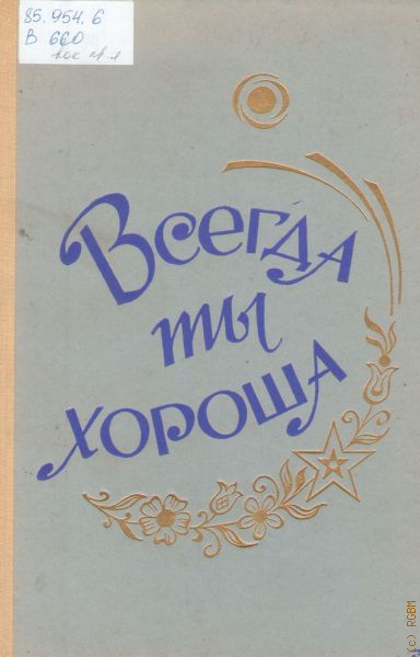 Россия / А. Новиков, сл. С. Алымова. Ты, Россия моя / С. Туликов, сл. С. Острового. Небо зовет / С. Туликов, сл. В. Татаринова. Я люблю свою землю / Е. Птичкин, сл. В. Харитонова. Москва / Б. Киселев, сл. А. Твардовского. Родина суровая и милая: из тф "Вечный зов" / Л. Афанасьев, сл. В. Фирсова. Как прекрасна жизнь: из тф "Вечный зов" / Л. Афанасьев, сл. И. Шаферана. Родная сторона / А. Флярковский, сл. И. Шаферана. Жена пилота / А. Флярковский, сл. В. Сергеева. Тепло отчизны / В. Непомнящий, сл. О. Беликова. Я люблю Россию / В. Гордеев, сл. В. Семернина. Все это в сердце у солдата / М. Шувалов, сл. Р. Акимова. Родимый дом / В. Букин, сл. Н. Шумакова. Песня о советской женщине / М. Абрамов, сл. М. Матусовского. Мать родная моя: из кф "Годы молодые" / П. Майборода, сл. А. Малышко. Родные наши женщины / Л. Печников, сл. Л. Кропоткина. Солдатские жены / Я. Дубравин, сл. В. Суслова. Солдаты вас благодарят / А. Экимян, сл. С. Бенке. Спой, сестрица / Вл. Петров, сл. А. Стрельчука. Память / Г. Лужецкий, сл. Ю. Гусева. песня о боевых подругах / А. Долуханян, сл. Е. Долматовского. Мать и сын / Р. Бойко, сл. А. Твардовского. Материснкие письма / О. Юдахина, сл. И. Черницкой. Узнай о верности моей / Ю. Гурьев, сл. В. Семернина. Верю тебе / И. Баранов, сл. В. Алферова. Снится солдатам дом родной / Е. Мартынов, сл. М. Пляцковского. Подруга / З. Компанейц, сл. М. Владимова. Шумит волна, звенит струна / Ю. Слонов, сл. В. Малкова. Если б гармошка умела: из кф "Солдат Иван Бровкин" / А. Лепин, сл. А. Фатьянова. Вальс на привале / В. Петров, сл. В. Семернина. Только ты / С. Маги, сл. Ю. Полухина. Июльские грозы / Л. Лядова, сл. Т. Пономаревой. У студеного колодца / В. Голиков, сл. Ю. Полухина. Тебе / В. Чернышев, сл. Л. Дымовой. Ты как зорька вдали / С. Кац, сл. А. Фатьянова. Очи васильковые / О. Агафонов, сл. Л. Морозова. Ничего не говорила / В. Соловьев-Седой, сл. А. Фатьянова. Через семь поясов / В. Солодахин, сл. Н. Сусловича. Мы вас подождем / Э. Колмановский, сл. К. Ваншенкина. Три года ты мне снилась / Н. Богословский, сл. А. Фатьянова. Что так сердце растревожено: из кф "Верные друзья" / Т. Хренников, сл. М. Матусовского. Сядь со мною рядом: из кф "Боксеры" / С. Кац, сл. А. Коваленкова, Д. Толмачева. Алые паруса / А. Ушкарев, сл. Б. Шифрина. Там, где вишни белые в цвету / Ю. Милютин, сл. В. Барынкина. Сердечная песенка / В. Мурадели, сл. С. Острового. Я всегда с тобой / В. Мурадели, сл. Я. Халецкого. Пусть дни проходят / Б. Терентьев, сл. И. Финка. Когда проходит молодость / В. Сорокин, сл. А. Фатьянова. Всегда ты хороша / Б. Мокроусов, сл. Н. Глейзарова. Услышь меня, хорошая / В. Соловьев-Седой, сл. М. Исаковского. Ласковая песня / М. Фрадкин, сл. Е. Долматовского. Как тебе служится? / Я. Френкель, сл. М. Танича. Хорошие девчата: из кф "Девчата" / А. Пахмутова, сл. М. Матусовского. Ой ты, рожь / А. Долуханян, сл. А. Пришельца. Звучи, любовь! / Е. Мартынов, сл. Р. Рождественского.