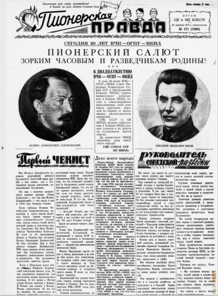Газета «Пионерская правда», декабрьский номер, посвященный 20-летию ВЧЛ_ГПУ_НКВД. (Рассказ «Незнакомец со свертком», рубрика «И взрослые и дети — все помогают наркомвнудельцам»).