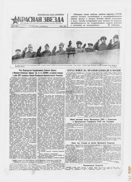 Газета Народного комиссариата обороны Союза ССР от 9 ноября 1941 года. О параде войск на Красной площади 7 ноября 1941 г., а также о парадах Красной армии 7 ноября 1941 г. в Куйбышеве и Воронеже.