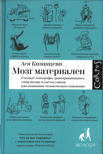 Ася Казанцева — известный научный журналист, популяризатор науки, лауреат премии «Просветитель» (2014). Ее третья книга посвящена строению и работе мозга, связям нейробиологии и психологии, «описанию разных экспериментов, старинных и современных, которые в совокупности формируют представление о том, что мозг познаваем». Автор, как всегда, ссылается на серьезные научные источники и в своем фирменном стиле старается донести до широкого круга читателей главные идеи: мозг — «наш главный рабочий инструмент» — материален, изменчив и неоднороден, «и осознание этих его свойств полезно в повседневной жизни».