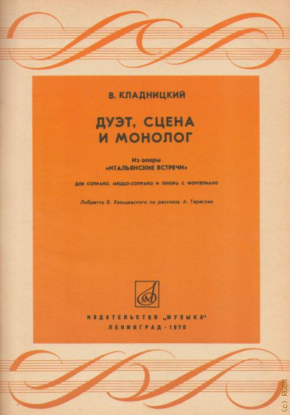 Дуэт, сцена и монолог: из оперы "Итальянские встречи": для сопрано, меццо-сопрано и тенора с фортепиано. Либретто В. Хвощевский, С. Давыдов по рассказу А. Тарасова