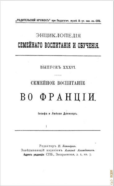 Данный выпуск энциклопедии семейного воспитания и обучения целиком посвящен организации семейного воспитания во Фрвнции (гувернантки, няни; питание и гигиена; гимнастика; религиозное воспитание и обучение музыке; чтение и детская литература и др.).