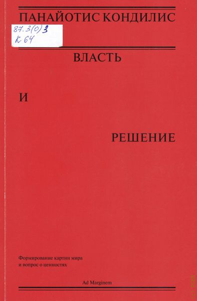 Панайотис Кондилис (1943—1998) — греческий философ и переводчик, написавший свои основные труды по-немецки. Впервые переведенная на русский язык книга «Власть и решение» (1984), одна из его центральных работ, представляет теорию дескриптивного децизионизма — ценностно-нейтрального понимания принятия решений и их связи с формированием представлений о мире и социальными отношениями. Опираясь на историцистский метод, а также на идеи Фридриха Ницше и Макса Вебера, автор обращается к проблеме социальной онтологии власти. В более поздней статье «Наука, власть и решение» (1994) Кондилис демонстрирует, что описанные им механизмы отношений власти распространяются и на научную сферу. Исследования Кондилиса сегодня обретают новую актуальность как образец продуктивного совмещения методов философии и социальных наук.
