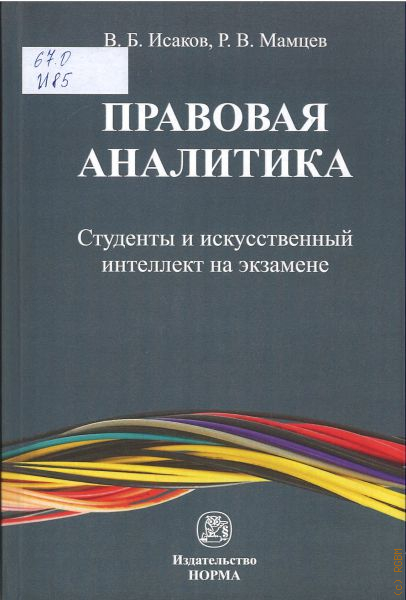 В российском образовании идет активный поиск форм использования искусственного интеллекта, что требует дополнительных усилий как от преподавателей, так и от студентов. Авторы книги провели оригинальный образовательный эксперимент: искусственному интеллекту (GhatGPT) предложили ответить на список экзаменационных вопросов по дисциплине «Правовая аналитика» и сопоставили его тексты с письменными ответами студентов. В итоге получился двойной тест: знаний студентов и возможностей искусственного интеллекта в сфере правовой аналитики, их можно сравнить. Для специалистов-аналитиков, преподавателей, аспирантов и студентов юридических и гуманитарных вузов и факультетов