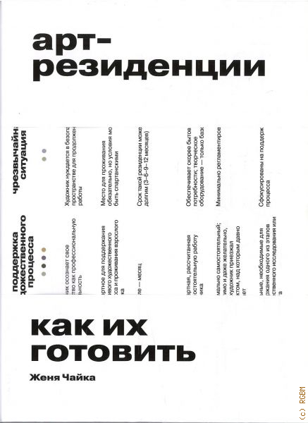 Первая в мире теоретическая монография, посвященная арт-резиденциям. «Арт-резиденции. Как их готовить» — это одновременно мемуары, практическое руководство, философский трактат и сборник кулинарных рецептов. Автор, куратор Женя Чайка, сначала систематизирует компоненты арт-резиденций, представляя их в виде таблицы ингредиентов. Затем она объединяет свои размышления в рассказе о двенадцати реальных и вымышленных резиденциях, каждой из которых соответствует особый обед. Например, «резиденцию постоянного движения», в которую художники зачастую отправляются ради коллективных путешествий, характеризует импровизированное меню из продуктов, что можно найти в пути. Гастрономическая метафора помогает избежать типологий и одновременно рассказать о принципах художественного процесса, среди которых — способы взаимодействия с пространством, публикой и коллегами, погружение в местный контекст и восприятие результатов. Женя Чайка (р. 1986) — председатель совета Ассоциации арт-резиденций России, куратор, исследователь. В сферу ее интересов входят философия, эстетика, теория и история выставок и резиденций, альтернативные образовательные форматы. С 2012 по 2018 год — куратор программы арт-резиденций Уральской индустриальной биеннале, лауреат премии «Инновация».