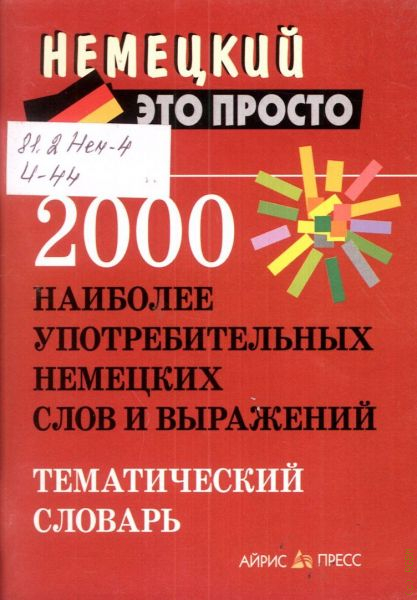 2000 слов и выражений, вошедших в этот словарь, - это лексический минимум, необходимый для полноценного общения на иностранном языке. Тематический принцип построения словаря позволяет быстро найти нужное слово и значительно пополнить словарный запас по той или иной теме за короткое время. Пособие адресовано преподавателям и всем тем, кто изучает немецкий язык