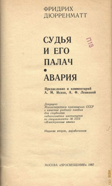 Дюрренматт Ф., Судья и его палач. Авария. книга для чтения на немецком языке для студентов педагогических институтов по специальности — 2103 "Иностранные языки" — 1987