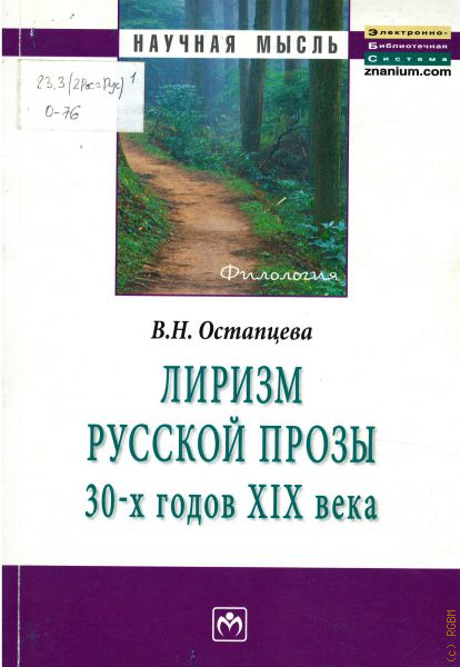 Остапцева В. Н., Лиризм русской прозы 30-х годов XIX века — 2011 (Научная мысль. Филология)