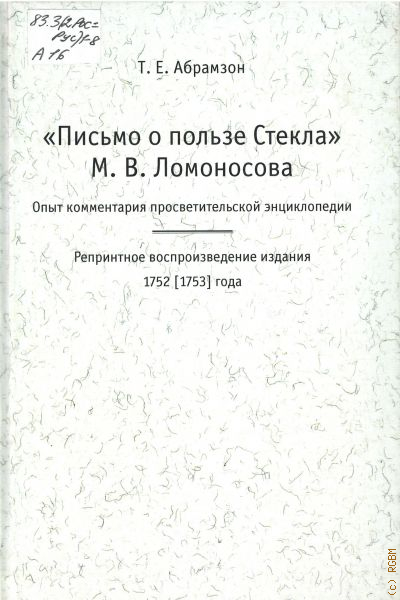 Абрамзон Т. Е., "Письмо о пользе Стекла" М.В. Ломоносова. опыт комментария просветительской энциклопедии. репринтное воспроизведение издания 1752 [1753] года. к 300-летию М. В. Ломоносова — 2010